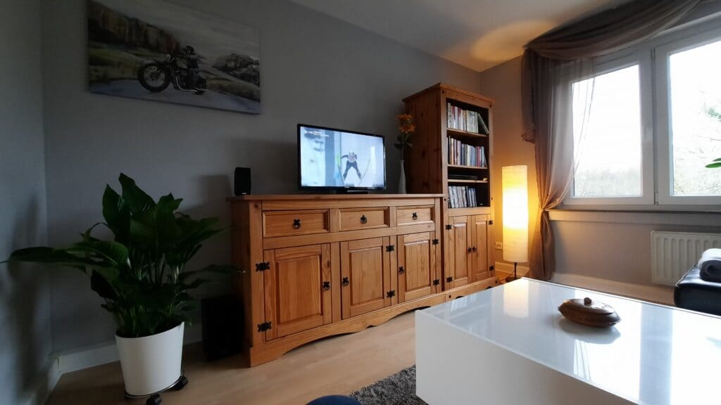 Der helle Wohnbereich lädt mit bequemer Couch und Sessel zum Verweilen ein. Ein moderner 4K-Smart-TV mit Satellitenempfang und Streaming-Möglichkeit sorgt für beste Unterhaltung. Bücher, DVDs und Gesellschaftsspiele stehen ebenfalls bereit – perfekt für gemütliche Abende.