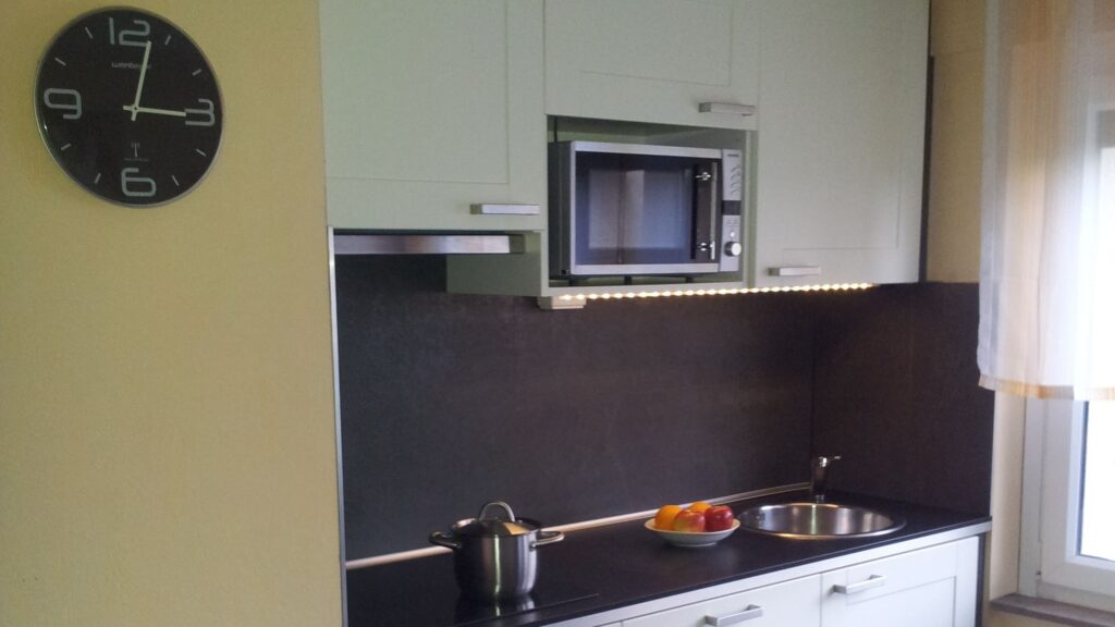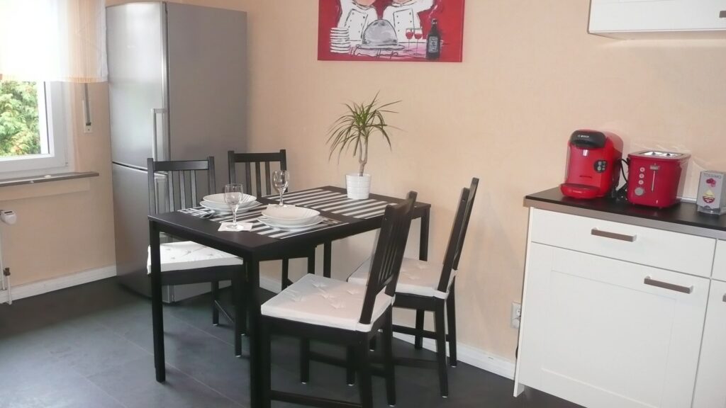 Induktionskochfeld, Mikrowelle, Mini-Backofen, große Kühl-Gefrierkombination, Kaffeemaschine (Tassimo & French Press), Toaster sowie umfangreiches Koch- und Essgeschirr. Auch grundlegende Gewürze sind vorhanden.