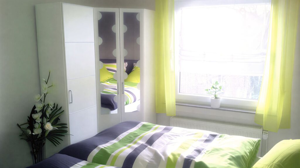 Im Schlafzimmer erwartet Sie ein hochwertiges Doppel-Boxspringbett mit atmungsaktiver Bettwäsche. Dimmbare Beleuchtung und ein geräumiger Kleiderschrank sorgen auch bei längeren Aufenthalten für höchsten Komfort.